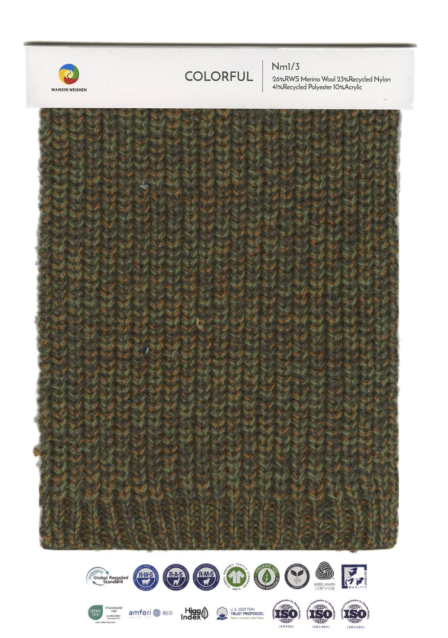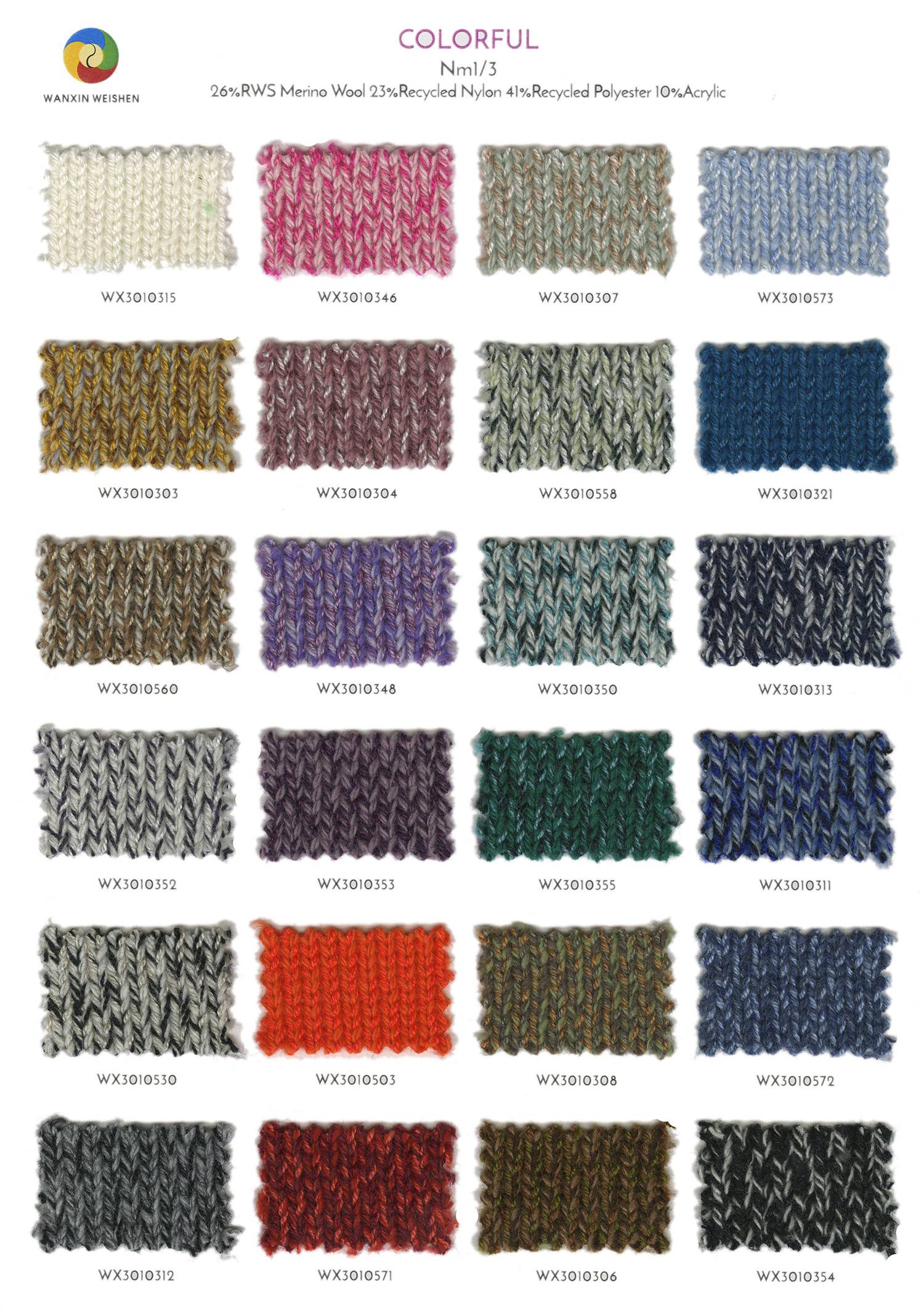成份:26%RWS美利奴羊毛 23%再生尼龍 41%再生滌綸 10%腈綸